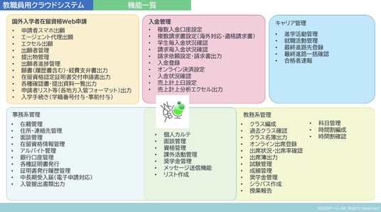 学生情報管理、出席管理、成績管理、留学申請・更新業務、証明書出力、出入国提出書類作成など多岐にわたる機能を有しています。