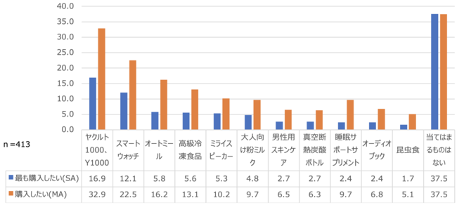 本ホワイトペーパーでは、ラインナップの11商品・ジャンルのうち、今後最も購入したいものを一つ選んでもらったところ「ヤクルト1000、Y1000」が16.9%と一番高い結果となりました。次いで高かったのが「スマートウォッチ」で12.1%でした。これについて「健康管理ができそう」「多機能で良さそう」「既に使っていて新しいものに買い替えたい」という声が寄せられていました。