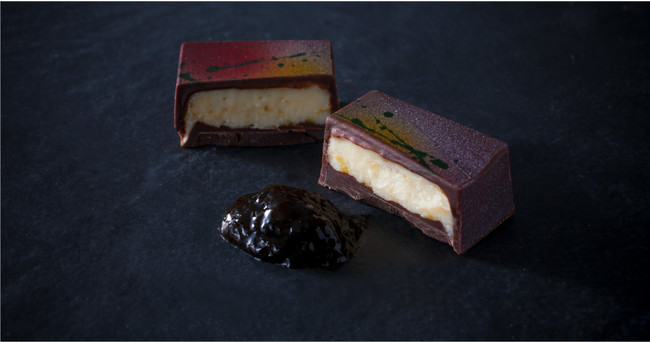 雲海に浮かぶように見える姿から「天空の城」ともいわれる竹田城跡をイメージ。生クリームで淹れた朝来産の煎茶とミルクチョコレートでガナッシュを作り、粉末状にした茶葉で香りを高めました。優しく繊細な味わいです。