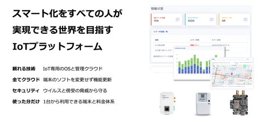 当社は、誰もがIoTの恩恵を享受できる社会の実現を目指し、独自開発のIoT向けOSを搭載したハードウェアおよびクラウドプラットフォームを通じて、多様な領域における機器の遠隔監視・制御やメンテナンスといったスマート化を可能にするソリューションを展開しています。