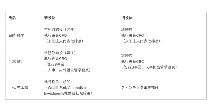 WealthPark株式会社(本社:東京都渋谷区、代表取締役:川田 隆太、以下「WealthPark」)は、2022年7月1日付で、以下の役員人事を実施しましたことをお知らせ致します。