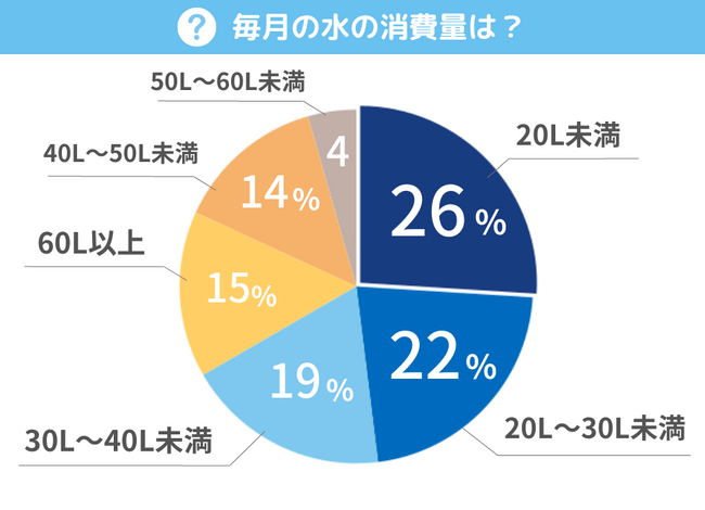 毎月の水の消費量は20L未満が最多で26%。一方、60L以上は全体の15%。