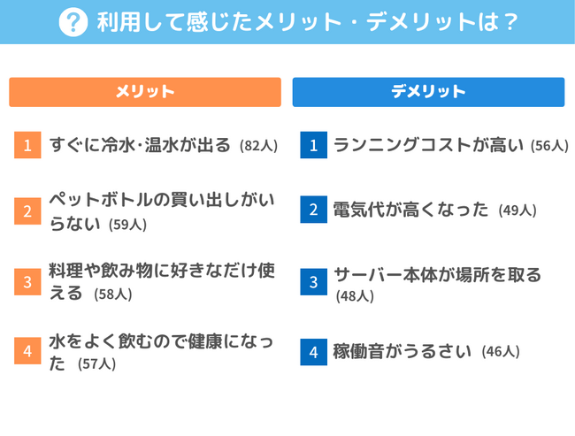 メリットは「すぐに冷水・温水がでる」が1位。デメリットは「ランニングコストが高い」が1位。