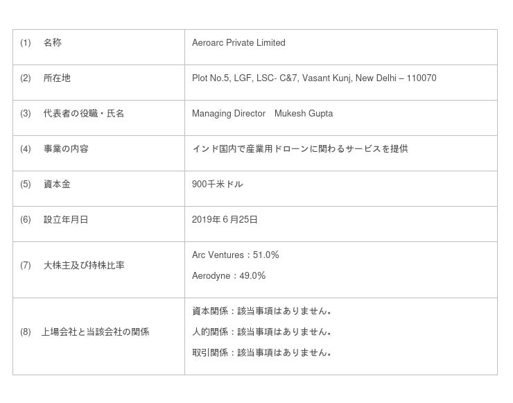 なお、Aeroarcは当社のインドにおける合弁会社ACSL Indiaの共同出資パートナーであります。Aeroarcの株主であるAerodyneはアジアで No.1の UAV サービスカンパニーに選出されたドローンサービスプロバイダー※2として世界35カ国でサービス展開しており、当社とは2020年11月より事業連携を開始しております。インドにおける合弁会社の設立については、以下の適時開示をご参照ください。