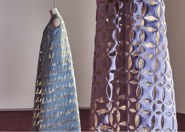 もう一つの「Alcantara-Jaden Cho Collaboration」と銘打たれたセクションでは、2020年のデビュー以来、ロンドンとソウルを拠点にする注目ブランドとして注目されているJaden Cho(ジェイデン・チョー)によって製作された4つの衣装が展示されました。