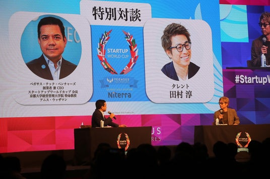 また、昨年度のスタートアップワールドカップ東京予選で優勝し、その後世界決勝戦でも優勝を手にしたアイリス株式会社(https://aillis.jp/) 代表取締役の 沖山翔氏、同じく昨年度の京都予選で優勝に輝き、世界決勝戦でもファイナリストに残ったHOMMA Group株式会社(https://www.hom.ma/) 代表取締役 本間毅氏が今年、世界に挑戦するスタートアップへアドバイスと同大会への挑戦したことによる飛躍的な事業拡大のエピソードをスピーチしました。