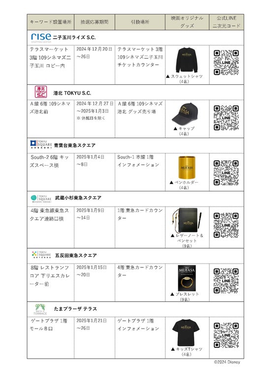 株式会社東急モールズデベロップメント(本社所在地:東京都渋谷区、代表取締役社長:佐々木桃子、以下:当社)は、ディズニー映画最新作『ライオン・キング:ムファサ』の公開を記念し、2024年12月20日(金)から2025年1月26日(日)の冬休み期間に、東急線沿線の6つの商業施設でタイアップ企画「公開記念キャンペーン」を開催します。