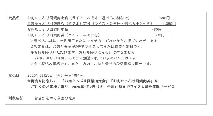 発売を記念して、「お肉たっぷり回鍋肉定食」「お肉たっぷり回鍋肉丼」をご注文のお客様に限り、2020年7月7日(火)午前10時までライス大盛を無料サービスいたします。
