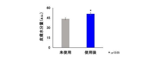 また、同じアミノ酸を配合した皮膚外用剤を11名の女性被験者(30~59歳、平均45.0歳)に1か月間使用させた結果、肌の水分量が増加することを確認しました。したがって、これらのアミノ酸は、肌の代謝活性を高め、老化による肌の機能低下を抑制すると考えられました。