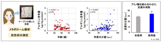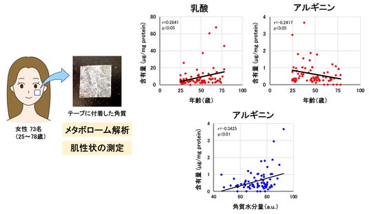 今回、20代から70代の女性の頬から粘着テープで角質を採取してメタボローム解析を行った結果、加齢に伴いアルギニンなどのアミノ酸が減少していることがわかりました。さらに、アルギニンなどのアミノ酸の量と肌の水分量に相関関係があることも見出しました。つまり、これらのアミノ酸が肌老化に関係していると考えられました。また、これらのアミノ酸を配合した皮膚外用剤を1か月間使用すると、肌の水分量が増加することも確認されました。今回見出したアミノ酸は、老化による肌の機能低下を抑制し、肌老化を防ぐ成分として期待されます。