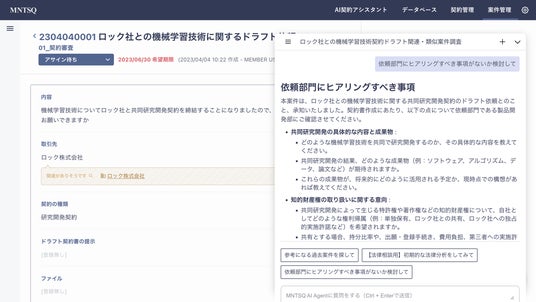 MNTSQ(モンテスキュー)株式会社(本社:東京都中央区、代表取締役:板谷 隆平、以下「当社」)は、提供する契約管理プラットホーム「MNTSQ CLM」の案件管理に、「MNTSQ AI Agent」を実装したことをお知らせいたします。