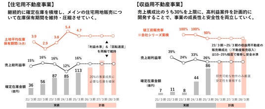 ともに、総利益率水準をKPIとし、住宅用不動産事業においては在庫保有期間、収益用不動産事業においては竣工前販売率をKPIとしました。