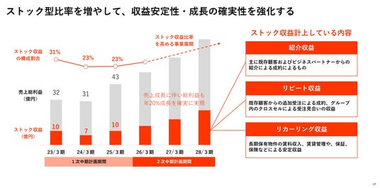 ※例えば、現在では個人向け1棟収益不動産の自社開発、販売を行っていますが、この賃貸付け→その後の賃貸管理業→保証業務などグループで収益として取り込むために、不動産管理会社のM&Aなどは継続的に検討していますが、これなどは非常に実現性の高いストック収益となる見込みです。