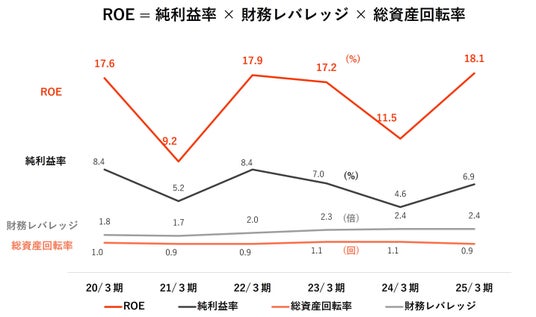 財務レバレッジの上昇(=自己資本比率の低下)はROEの向上要因ですが、不動産業においては必ずしもプラスではありません。しかし、当社では自己資本比率が40%と高く、安定した需要が見込まれる住宅用在庫がメインとなっているため、現状は財務レバレッジが上昇しても事業としての安全性は保ったまま、ROE上昇に寄与することが可能です。