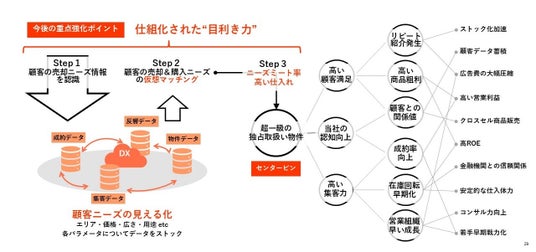 不動産業における仕入というのは属人化しがちですが、顧客満足度を高め→紹介・リピートを増やし→高い集客率を確保(≒早い在庫回転)することが重要な当社にとって、この仕入れのポイントである目利き力の仕組化が重要です。