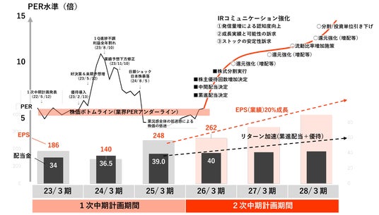 一方で中期計画発表後、PER15倍目標については、個人投資家の方々からは「ちょっと高い目標なのでは?」というお声を頂いておりますが、当社の成長性に鑑みれば、進行期の当期純利益E(Earning)に対する妥当な期待値R(Ratio)だと考えています。