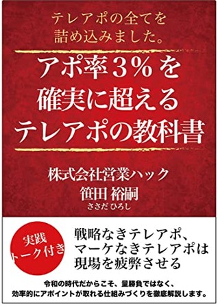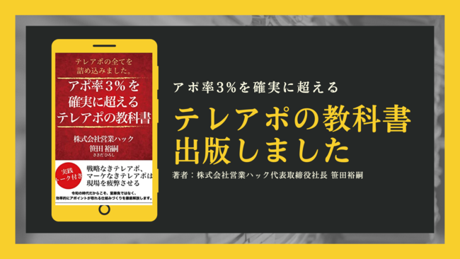 「営業の悩みを0にする」をミッションにテレアポ代行・インサイドセールス代行を行っている株式会社営業ハック(本社:東京都港区、代表取締役:笹田裕嗣)。この度、代表の笹田が電子書籍「アポ率3%を確実に超えるテレアポの教科書」を出版したことをお知らせいたします。日々架電をされている方にも、営業マネージャーの方にも、ぜひご一読いただきたい書籍が完成しました。