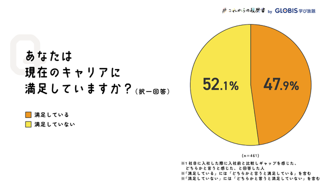 1社目で入社後ギャップを感じていた若手社会人に、現在のキャリアへの満足感を尋ねると、約半数が「満足していない」と回答しました(図4)。