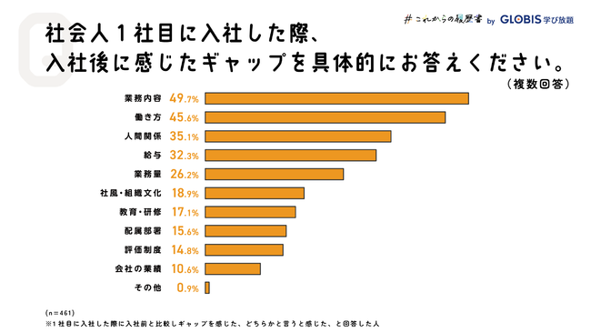 近年、「入社後ギャップ」「リアリティショック」などの言葉とともに、入社前後のギャップで仕事に対するやりがいを見失ってしまうことが問題として取り上げられています。さらに調査結果からは、新卒入社した際に、入社前に抱いていた仕事へのイメージとギャップを感じた若手社会人が、その後も不満を持ち続ける傾向にある様子が浮かびます。