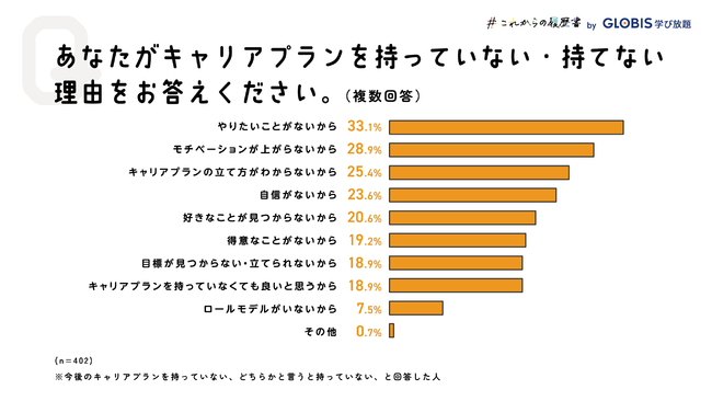 変化が激しく、未来が予測しづらい時代。GLOBIS 学び放題では、「自分らしいキャリアを描きたい」「未来に向けてどのように歩めばいいか分からない」と感じている若手ビジネスパーソンへのヒントとして、若手の学び応援企画「#これからの履歴書」を通じて情報発信しています。10月11日に発表した若手社会人の学びに関する実態調査に続き、第2弾として、キャリア観に関する調査を実施、特設サイトを用意しました。本調査では、多くの若手社会人が「今後のキャリアプランを持っていない」という実態が明らかになりました。