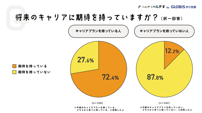 この結果を詳しく見てみると、キャリアプランを持っている人の約7割が「将来のキャリアに期待を持っている」と回答。一方、キャリアプランを持っていない人の約9割が「将来のキャリアに期待を持っていない」と答えました(図14)。