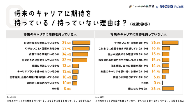 将来のキャリアに期待を持っている人に理由を尋ねると、「自分の成長を実感しているから」「やりたいこと・目標があるから」といった回答が上位に入りました。一方、将来のキャリアに期待を持っていない人に理由を尋ねると、「やりたいこと・目標がないから」「これまでに成長をあまり実感していないから」といった回答が上位に入りました(図13)。