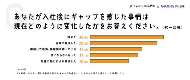 若手社会人の約6割が、新卒入社した際に、入社前と比較し「ギャップを感じた」と回答しました(図1)。さらに、「具体的にギャップを感じた事柄」について尋ねると、多くの人が「業務内容」や「働き方」についてギャップを感じていたことが分かりました(図2)。また「入社後、ギャップを感じた事柄は現在どのように変化したか」という問いに対し、 「諦めた」が34.5%、「継続して不満/課題感を持っている」が17.6%と、約半数の若手社会人がギャップを解消できずにいることが伺えます(図3)。