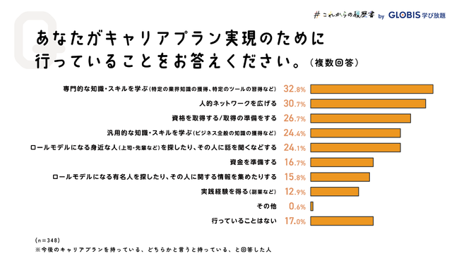 一方で、「キャリアプランを持っている」と答えた人に対し、キャリアプラン実現のためにしていることを尋ねると、「専門的な知識・スキルを学ぶ(特定の業界知識の獲得、特定ツールの習得など)」「人的ネットワークを広げる」といった回答が上位に入りました(図11)。