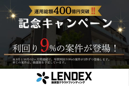 この度、融資型クラウドファンディング「レンデックス(LENDEX)」を運営する株式会社LENDEX(本社:東京都渋谷、代表取締役:中村 智)は、累計運用総額400億円突破を記念し、特別キャンペーンを開催することをご報告いたします。