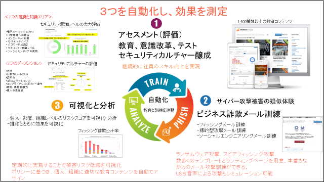 KnowBe4の統合型プラットフォームの中核となるものが、Train-Phish-Analyzeのサイクルです。これまでのセキュリティ教育の問題点は頻度だけではありません。成果が見えない研修プログラムが大きな問題でした。KnowBe4プラットフォームでは、トレーニングとメール訓練を組み合わせて実行して、学習の成果を可視化・分析することができます。