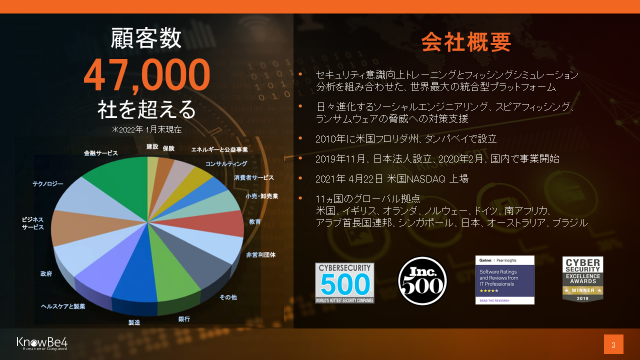 KnowBe4(NASDAQ: KNBE)は、セキュリティ意識向上トレーニングとフィッシングシミュレーション・分析を組み合わせた世界最大の統合型プラットフォームのプロバイダーです。KnowBe4は、IT/データセキュリティ・エキスパートであるStu Sjouwerman(ストゥ・シャワーマン)によって2010 年8 月に米国フロリダ州タンパベイで設立され、セキュリティの「人的要素:ヒューマンエラーの克服」にフォーカスして、ランサムウェア、CEO攻撃/詐欺、ビジネスメール詐欺(BEC)を始めとする巧妙化するソーシャルエンジニアリング手口などの社員ひとり一人のセキュリティに対する認識を高めることで、「人」を狙うセキュリティ脅威から個人、組織、団体を防御することを支援しています。世界で最も著名なサイバーセキュリティ・スペシャリストであるKevin Mitnick(ケビン・ミトニック)がCHO(Chief Hacking Officer)を務めています。同氏のハッカーの視点に立った知見をベースにKnowBe4のトレーニングプログラムは組み立てられています。2022年2月現在、 4万7千社を超える企業や団体がKnowBe4を採用して、防御の最終ラインとして「人」による防御壁を構築しています。KnowBe4についてさらに知りたい方は、www.knowbe4.jp をアクセスしてください。