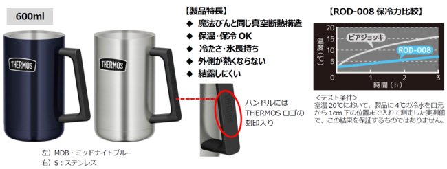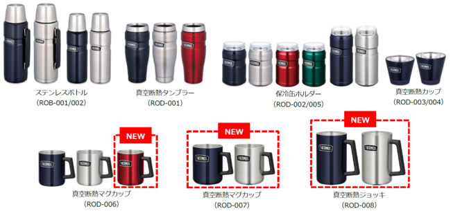 今回は、ドリンクシーンを充実させる全2種5アイテムが新登場。大容量600mlのドリンクが楽しめるハンドル付きジョッキタイプの「真空断熱ジョッキ(ROD-008)」が新たにアウトドアシリーズに加わりました。また、「真空断熱マグカップ」シリーズに新サイズ450mlの「真空断熱マグカップ(ROD-007)」が登場。既に展開している350mlサイズの「真空断熱マグカップ(ROD-006)」は新色を追加し、タンブラーや缶ホルダーでも人気カラーのクランベリーが1色加わります。