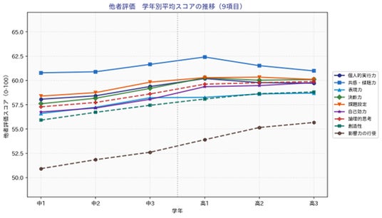 分析対象は、25コンピテンシーのうち自己評価・他者評価の双方で有効回答率が特に高い9項目(課題設定、創造性、論理的思考、個人的実行力、自己効力、決断力、表現力、共感・傾聴力、影響力の行使)に絞っています。信頼性の高いデータが揃う項目に集中することで、学校・学年間の比較や経年トレンドをより精度高く分析しています。