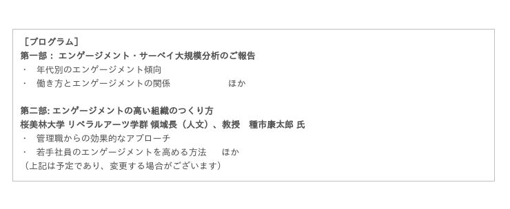 本セミナーでは、企業で実施されたエンゲージメント・サーベイ『Qraft(クラフト)』の分析結果より、年代別にみられる傾向や、テレワーク等の働き方×エンゲージメントの関係をご報告。さらに、昨今、エンゲージメントを高めるカギとして注目を集める“ジョブ・クラフティング”研究の第一人者 種市 康太郎氏(桜美林大学 リベラルアーツ学群 領域長(人文)、教授)より、エンゲージメントの高い組織のつくり方について、効果的な打ち手を解説します。データと事例にもとづく、実践的なヒントのつまったセミナーです。