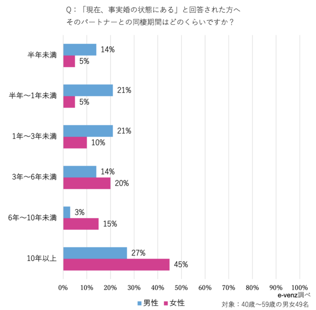 同棲期間で最も多かったのが、男女共に「10年以上」でした。特に女性が45%と顕著に高い割合となっています。