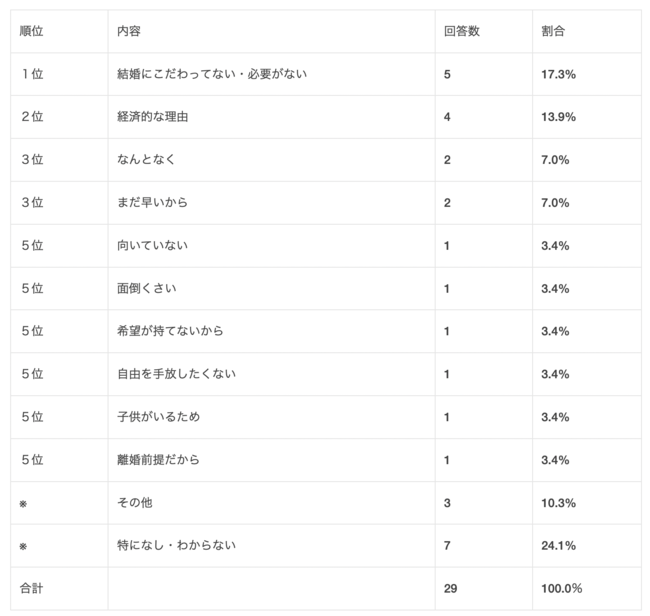 そのほか、男性では「向いていない」「自由を手放したくない」、女性が「一回離婚しているから」「家族が反対している」などの回答がありました。