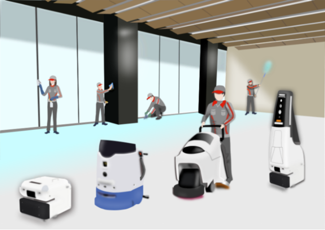 清掃の分野だけでなく、警備や運搬等さまざまな分野でロボットを活用することで、管理品質の向上につながる新たなサービス設計の構築を目指します。また、ロボットの走行データをはじめ、防犯カメラを利用した人流データ、ゴミの量、気象情報など、建物にまつわるあらゆる情報の収集・分析を進め、建物オーナーやパートナー企業とともにロボットフレンドリーな建物設計・改修を行い、人とロボットが共存する社会に貢献していきます。