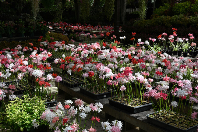 当園のダイヤモンドリリーは1986年当園に導入以来品種改良を重ね、一般的なダイヤモンドリリーよりも遥かに大輪で、手まりのように咲く優良品種です。販売も10月29日(土)から開始します(展示温室内)。