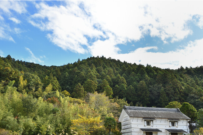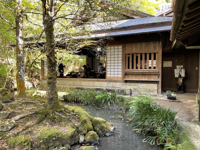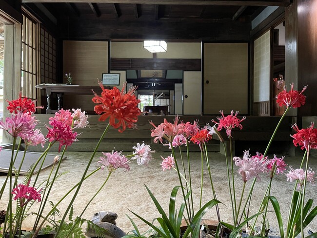 受付からすぐの展示温室では、一番多い時で3,000 株ほどが展示され、ガラス張りの天井から明るい陽の光が差し込むと、花弁がキラキラと輝く様子がご覧になれます。一方、外の花菖蒲園の東側に位置する築250 年の庄屋屋敷では、土間や農機具小屋に置かれた古道具などを使ってダイヤモンドリリーを展示。和と洋が融合した美しいアレンジメントを見ることができます。庄屋屋敷の味噌蔵跡のお茶処「桑源亭(そうげんてい)」で地元掛川市原里地区のお茶や軽食もお楽しみいただけます。秋深まる加茂荘でお待ちしております。