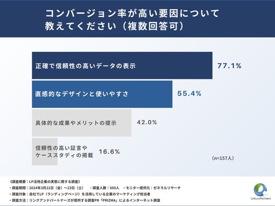 上記の調査結果から、LPを活用する企業の85%以上がその効果に満足していることが明らかになりました。満足の理由としては「デザイン力が高い」、「構成のクオリティが高い」、「コンバージョン率が高い」という点が挙げられています。特に、高いコンバージョン率を支える要因として「正確で信頼性の高いデータの表示」、「直感的なデザインと使いやすさ」が重要視されています。さらに、LP制作における成果の鍵は「印象的なファーストビュー」、「データの信頼性」、「効果的なCTAの配置」となっており、これらがLP成功のための不可欠な要素であることが示されました。