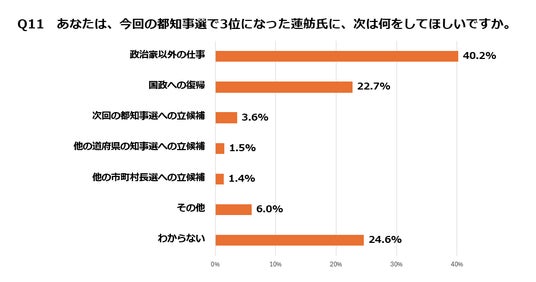 3位だった蓮舫氏に次は何をしてほしいかを聞くと、政治家以外の仕事が40.2%で最も多く、次いで国政への復帰の22.7%となった。蓮舫氏に投票した人に限ると、国政への復帰が最多で6割に上った。