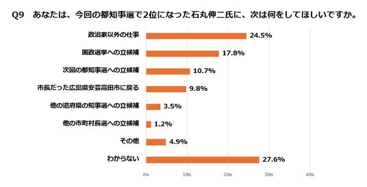 得票数が2位だった石丸伸二氏について次は何をしてほしいかを聞くと、政治家以外の仕事が24.5%とトップで、次いで国政選挙への立候補が17.8%。