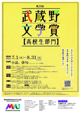 武蔵野大学国文学会(東京都西東京市)は、高校生の創作活動の推進および若き才能発掘を目的に「第29回武蔵野文学賞 (高校生部門)」の小説・俳句作品を2021年7月1日(木)~8月31日(火)の期間で募集しました。この度、選考委員による審査の結果、各賞の受賞作品が決定しました。