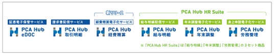 『PCA Hubシリーズ』は、"手に届く価格"で"手が届かなかった業務効率最適化"を実現するクラウド型の業務支援サービスで、『PCA Hub eDOC』、『PCA Hub 取引明細』、『PCA Hub 給与明細』、『PCA Hub 年末調整』、『PCA Hub 労務管理』、『PCA Hub 経費精算』がリリースされています。