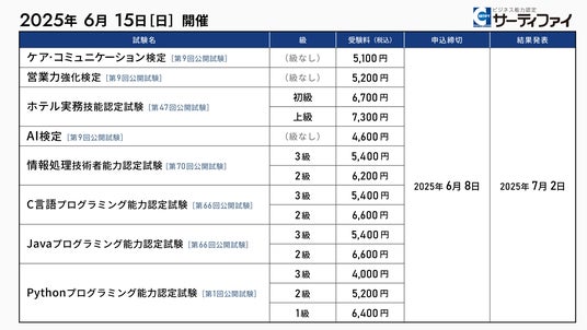 株式会社サーティファイ(本社:東京都中央区、代表取締役:瀧澤茂、以下「サーティファイ」)は、2025年6月15日(日)に開催する「ケア・コミュニケーション検定」「営業力強化検定」「ホテル実務技能認定試験」「AI検定」「情報処理技術者能力認定試験」「C言語プログラミング能力認定試験」「Javaプログラミング能力認定試験」「Pythonプログラミング能力認定試験」の公開試験の申込受付を2025年4月1日より開始しました。
