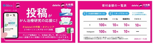 1.クレシアの商品やロゴに関連する「C」の部分を自由なカタチで消した画像や動画を、想いとともに「#deleteC大作戦」と「#クレシア」をつけて参加者がSNS【X、Instagram】で投稿すると1投稿あたり100円をdeleteCへ届けます。