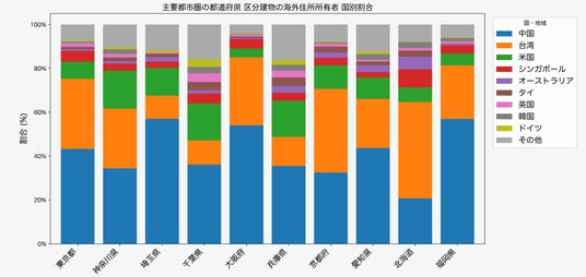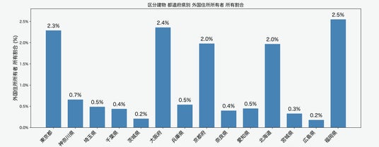 国外住所所有者の取得割合を3大都市圏・主要地方都市圏で比較すると、東京都・大阪府・福岡県が上位を占めています。一方、同じ都市圏内の神奈川県・埼玉県・千葉県や兵庫県・奈良県は0.5%以下にとどまっており、各都市圏の中心都市への集中傾向が明確です。