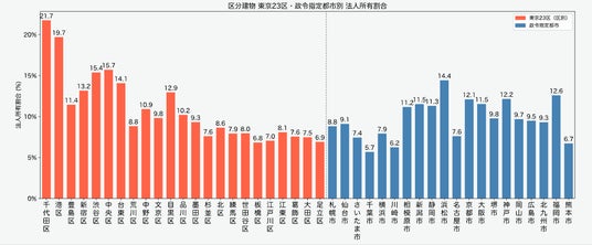 法人所有割合は国外住所所有者と比較して地域間の差が小さく、全国的に一定程度存在しています。都道府県別では京都府・兵庫県・福岡県が上位を占め、東京23区では千代田区・港区など都心部で高くなっています。