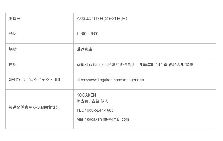 NOBORDERz (ノーボーダーズ:CEO Rio Takeshi Kubo)が開発を行うWeb3.0メタバースプロジェクト「XANA(ザナ)」が2022年7月10000体を完売した、XANA: Genesis NFTのユーティリティの1つでもある商用権を利用したNFT原画展を5月19日(金)~5月21日(日)の3日間京都「世界倉庫」にて開催。数千人のホルダーの中から抽選で選ばれたNFTをホルダーでもある現代アーティスト「KOGAKEN」がキャンバスに描き起こし、来場者はアートはもちろん、NFTやメタバースにも触れることが出来るイベント内容となっている。