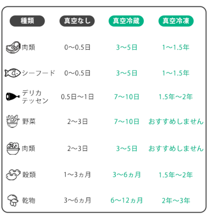 食品の変質させる最大の原因は酸化と菌の増殖です。肉類や魚類を冷蔵保存した場合、その保存期間は約3日です。しかし、肉や魚、野菜は真空容器を利用して保存することで、利用しない場合に比べて鮮度を大幅に長く保つことができます。